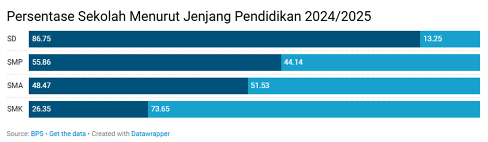 - Pada jenjang SMK, dominasi sekolah swasta semakin kuat, mencapai 73,65 persen.