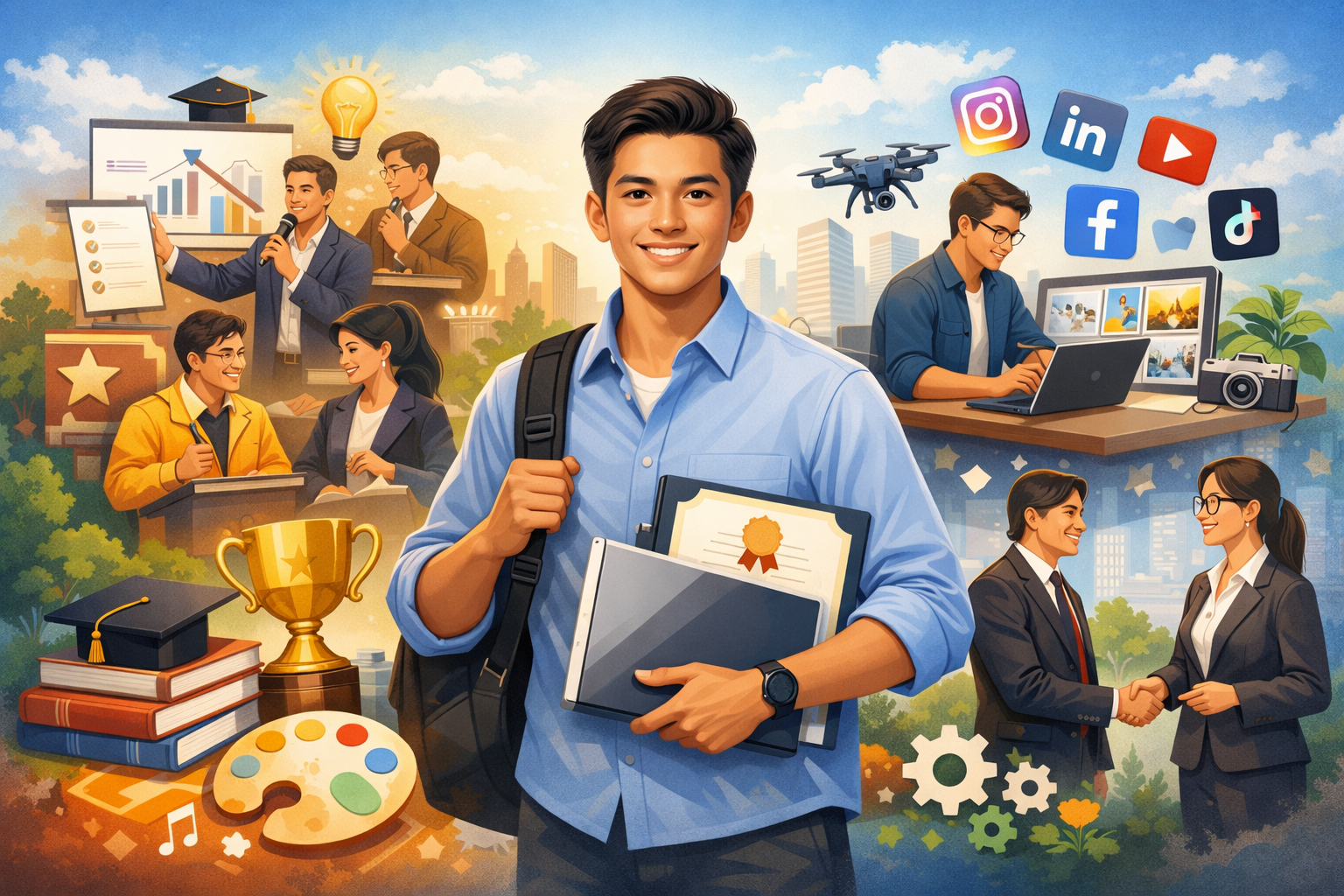 Personal branding mahasiswa merupakan upaya membangun citra diri profesional yang menonjolkan keunikan, nilai, serta kompetensi yang dimiliki. Citra ini tidak hanya dibentuk melalui prestasi akademik, tetapi juga melalui aktivitas di kampus, kehadiran di media sosial, portofolio karya, hingga interaksi langsung di lingkungan sekitar. Dengan personal branding yang kuat, mahasiswa akan lebih mudah dikenal dan dilirik untuk berbagai peluang karier.