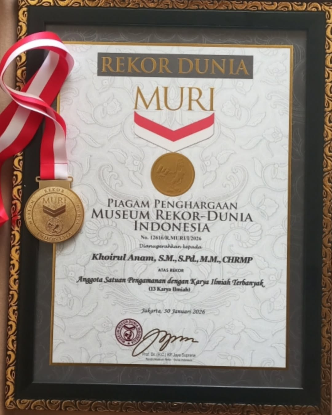Capaian tersebut mengantarkannya meraih rekor Museum Rekor Dunia Indonesia (MURI) sebagai anggota satuan pengamanan dengan karya ilmiah terbanyak. Meski memiliki capaian akademik, Anam tetap bersyukur dengan profesinya saat ini sembari terus berusaha mengejar cita-citanya menjadi pengajar.